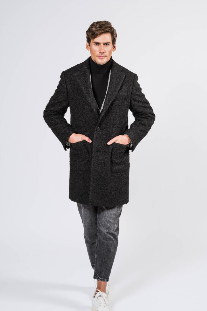 Timeless elegance and essential lines for this single-breasted coat in fine bouclé wool with an exclusive colour. A curled coat that stands out for its structure and refined construction elements. A slender design to dress the modern gentleman with style.