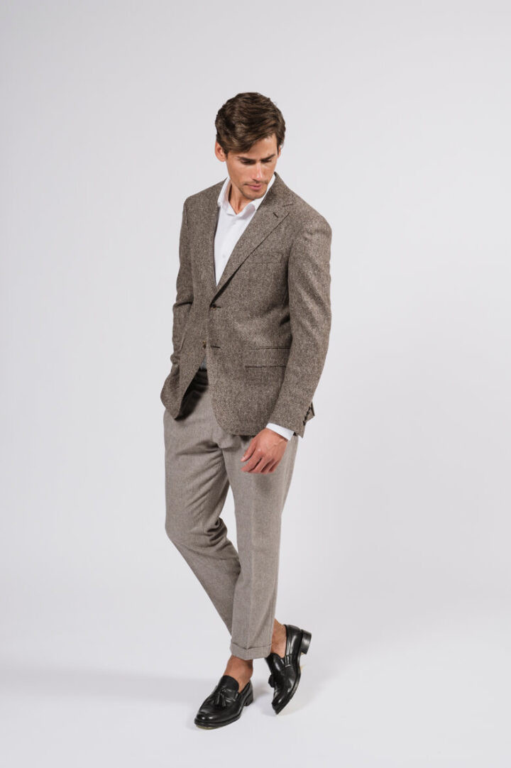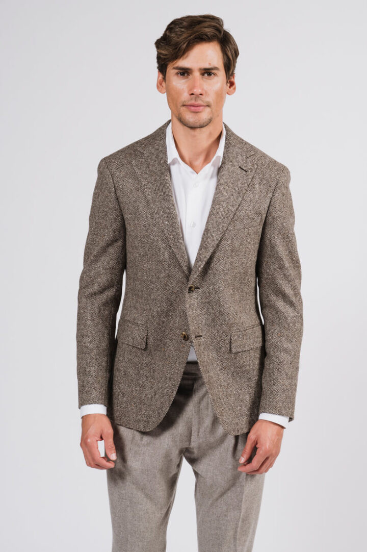 More detailsSingle-breasted jacket in a precious micro-pattern of shetland wool, with soft and simple lines for a contemporary fit. The refined details, such as the cut pockets with flap, are combined with a distinctive two-tone color that enhances the tailoring. An emblem of formal men’s clothing, for the man who always seeks impeccable style.