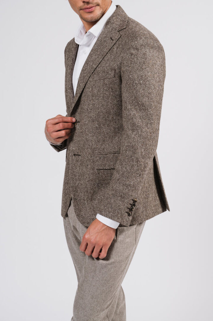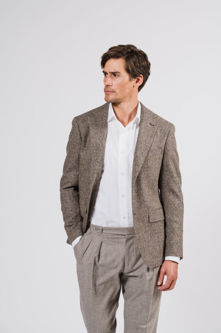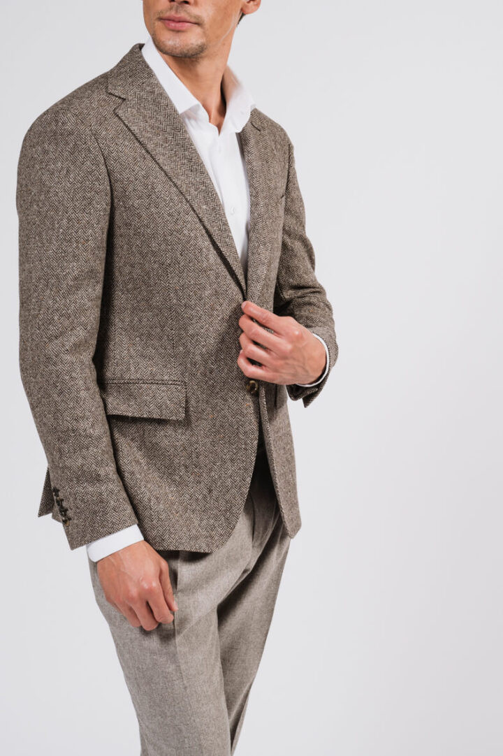 Single-breasted jacket in a precious micro-pattern of shetland wool, with soft and simple lines for a contemporary fit.
