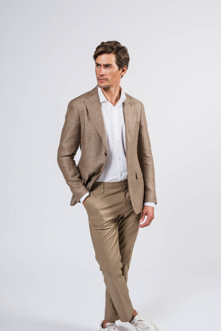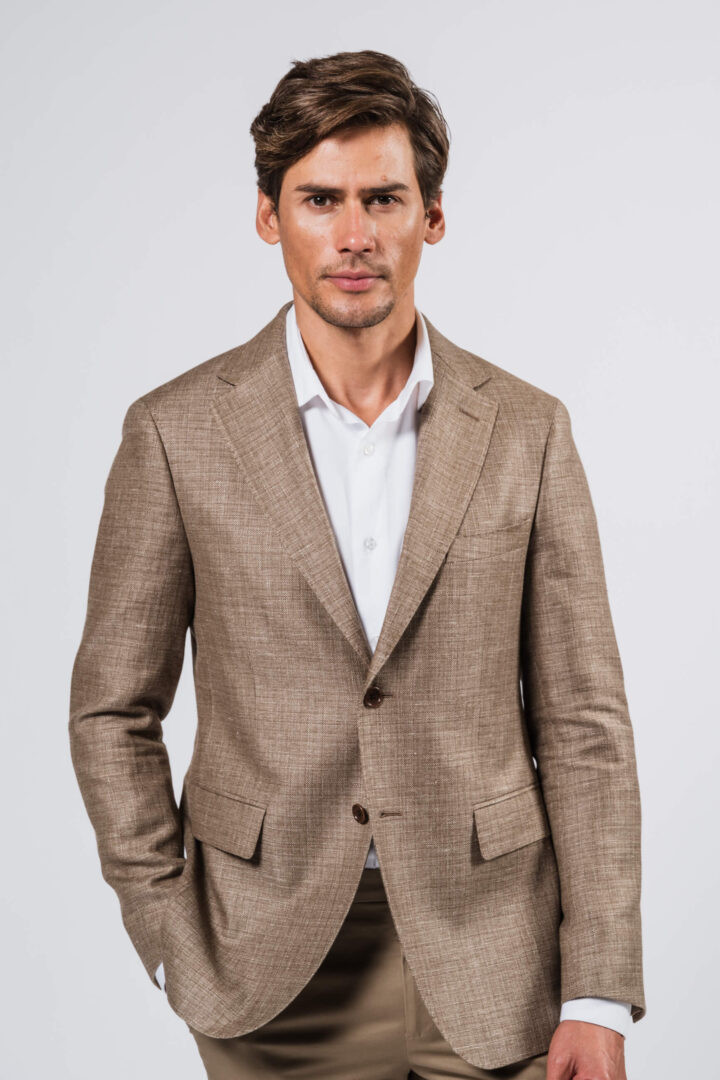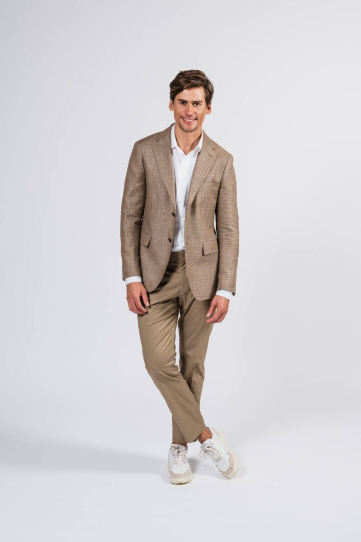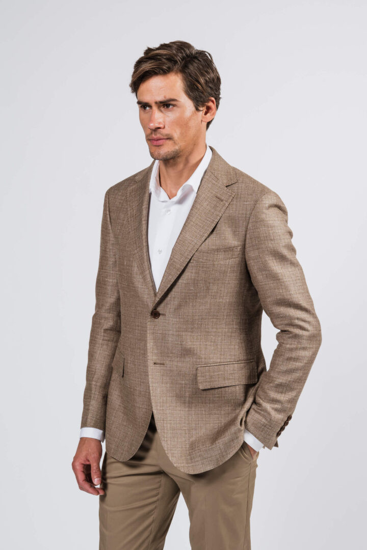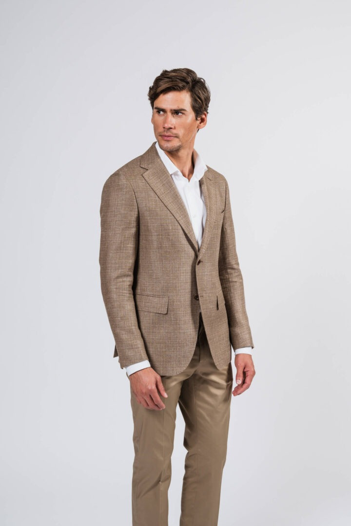 Made from a blend of linen and wool, it combines the lightness of the unlined design with the performance of a fine fabric.