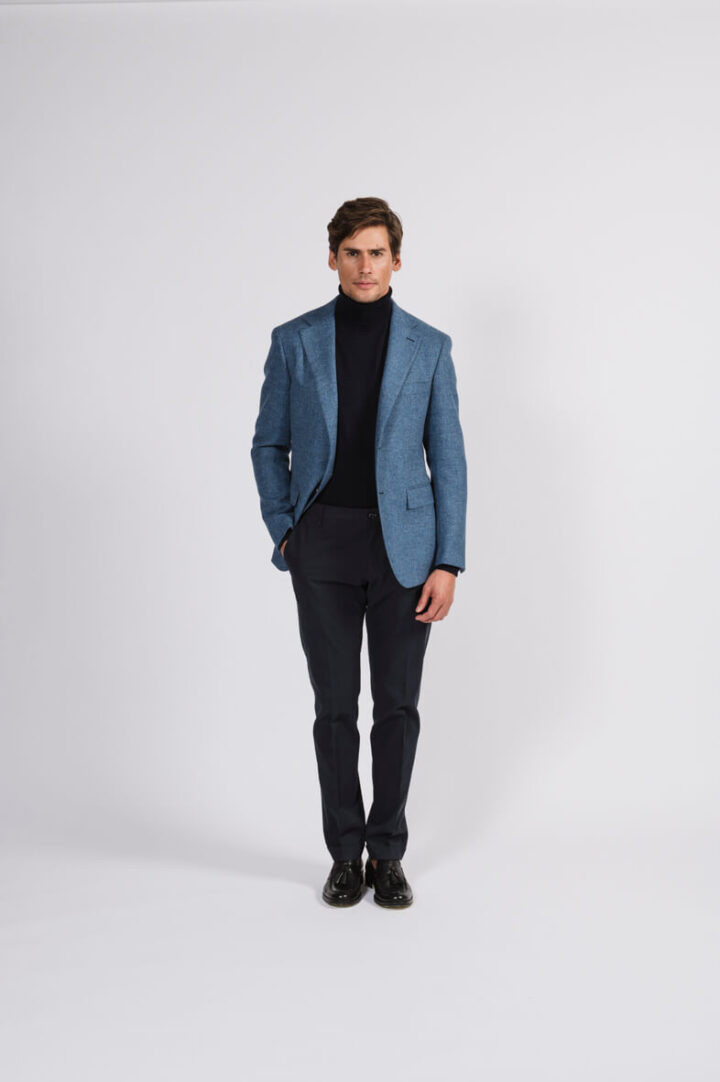 Single-breasted jacket with two buttons – Double profile pockets with flap and left piping pocket – Tailored stitching – Composition 100% wool – Regular fit – Made in Italy