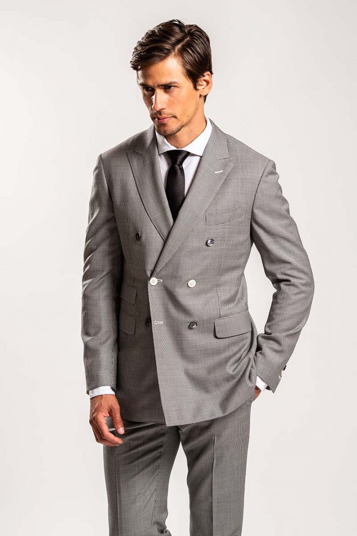 Double-breasted jacket with six buttons – Full canvas – Peak lapel – Double-profile pockets with flap, third pocket with flap on the right and left piping pocket – Trousers without pleats – American pockets and two double-profile back pockets – Composition 100 % wool – Regular fit – Made in Italy