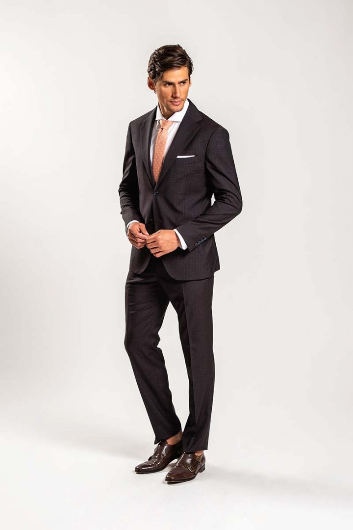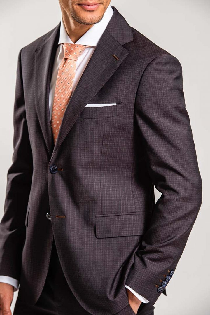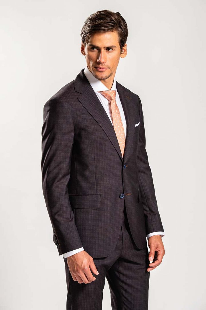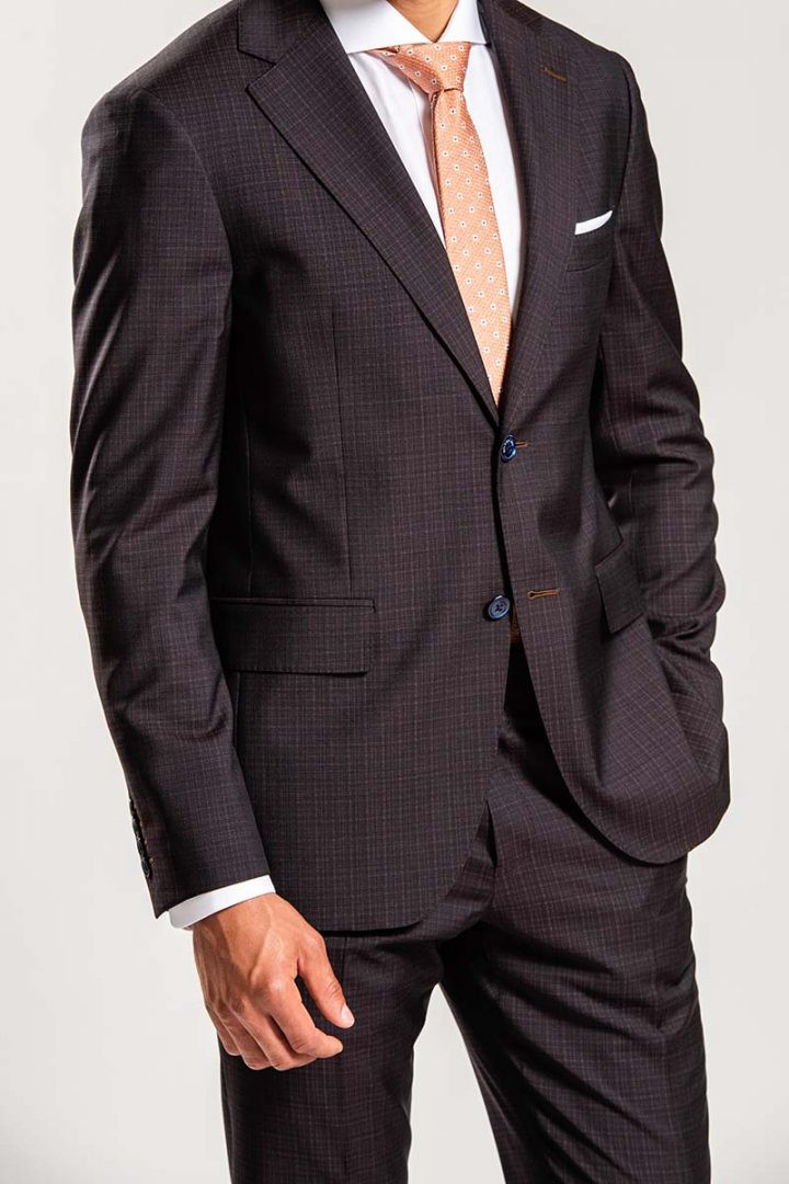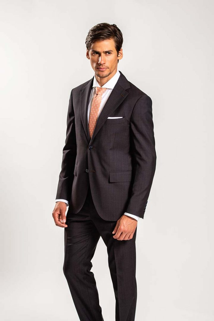 More detailsCharacterized by an original copper micro-pattern, this model stands out for its elegance and the comfort of the regular fit. Consisting of a single-breasted jacket and trousers without pleats, its refined details such as the peak lapels and the cut pockets with flaps take the spotlight. All these details make the garment truly unique and suitable for any formal occasion.