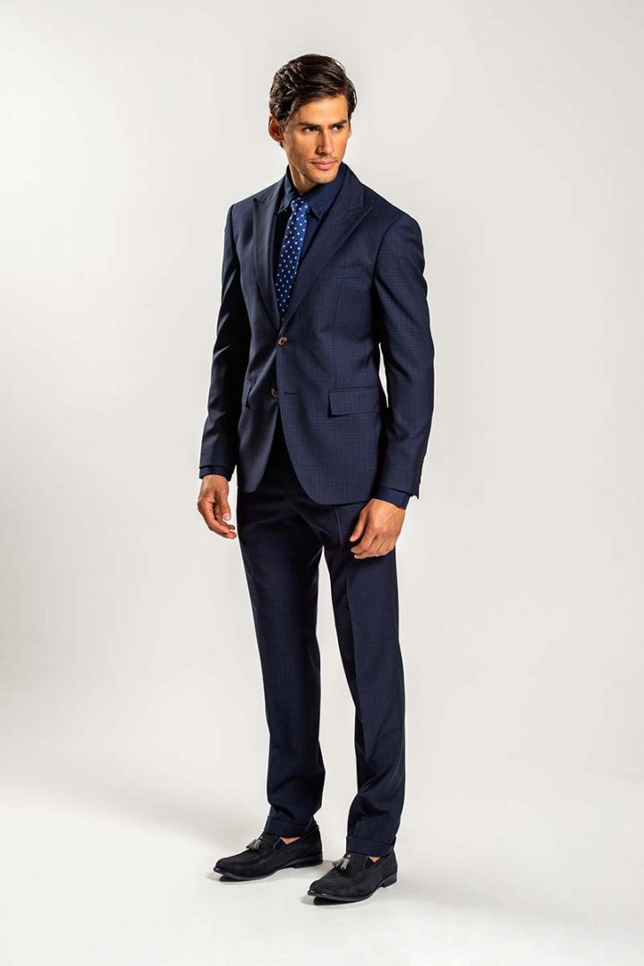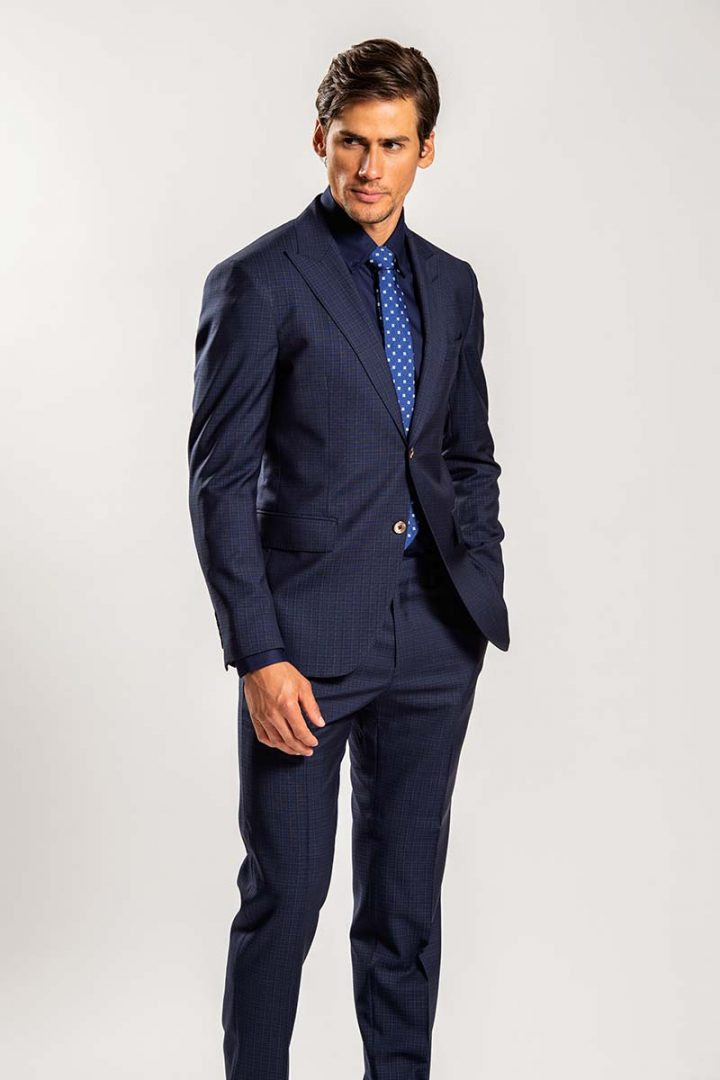 Characterized by an original micro-pattern in blue shades, this model stands out for its elegance and the comfort of the regular fit. Consisting of a single-breasted jacket and trousers without pleats, its refined details such as the peak lapels and the cut pockets with flaps take the spotlight. All these details make the garment truly unique and suitable for any formal occasion.