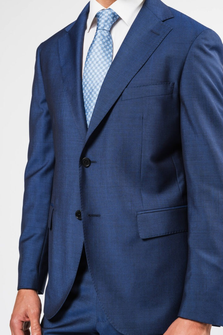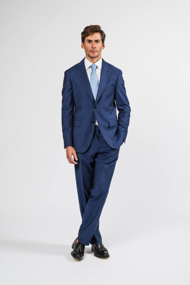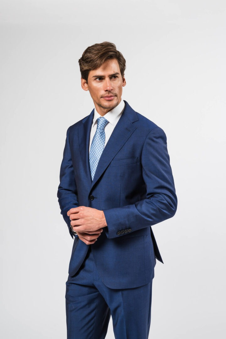 Single-breasted jacket with two buttons – Double-profile pockets with flap and left piping pocket – Trousers without pleats – American pockets and two double-profile back pockets – Composition 100% wool – Regular fit – Made in Italy