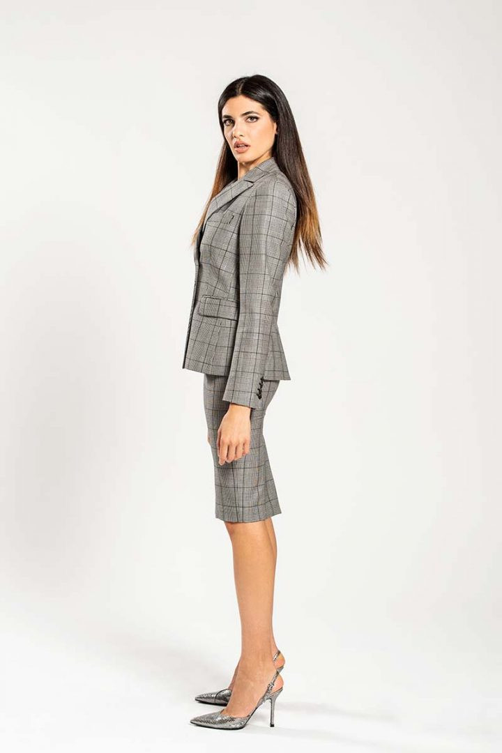Double-breasted jacket with four buttons – Double-profile pockets with flap and left piping pocket – Pencil skirt – Composition 100% wool – Regular fit – Made in Italy