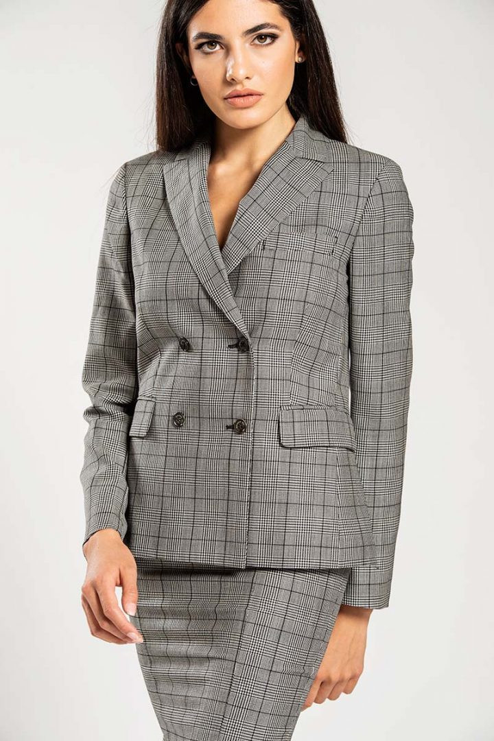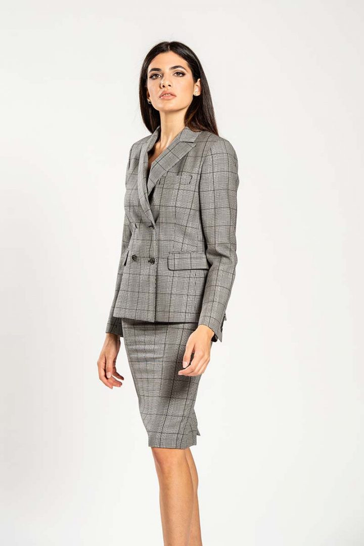 More detailsA garment with comfortable lines interpreted in a Prince of Wales wool fabric, the right compromise of elegance and style. Consisting of a double-breasted jacket and a pencil skirt, the refined pattern gives dynamism, while the stylistic elements, such as the cut pockets with flap and the peak lapel, communicate sophistication. The combination of perfection for the woman seeking success.