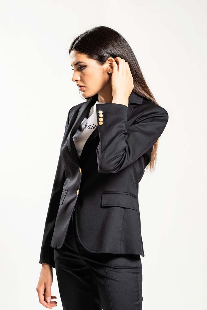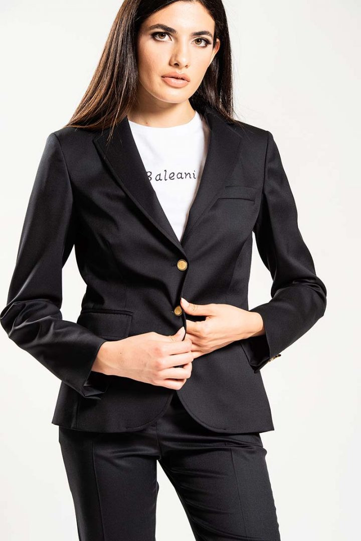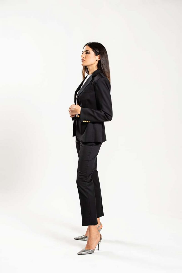 Made from a classic wool fabric and with an easy design, this regular suit depicts the woman in search of elegance. Consisting of a single-breasted jacket and fitted trousers, it is characterized by tailoring and research into details which can be the cut pockets with flap or the gold button to enrich the garment.