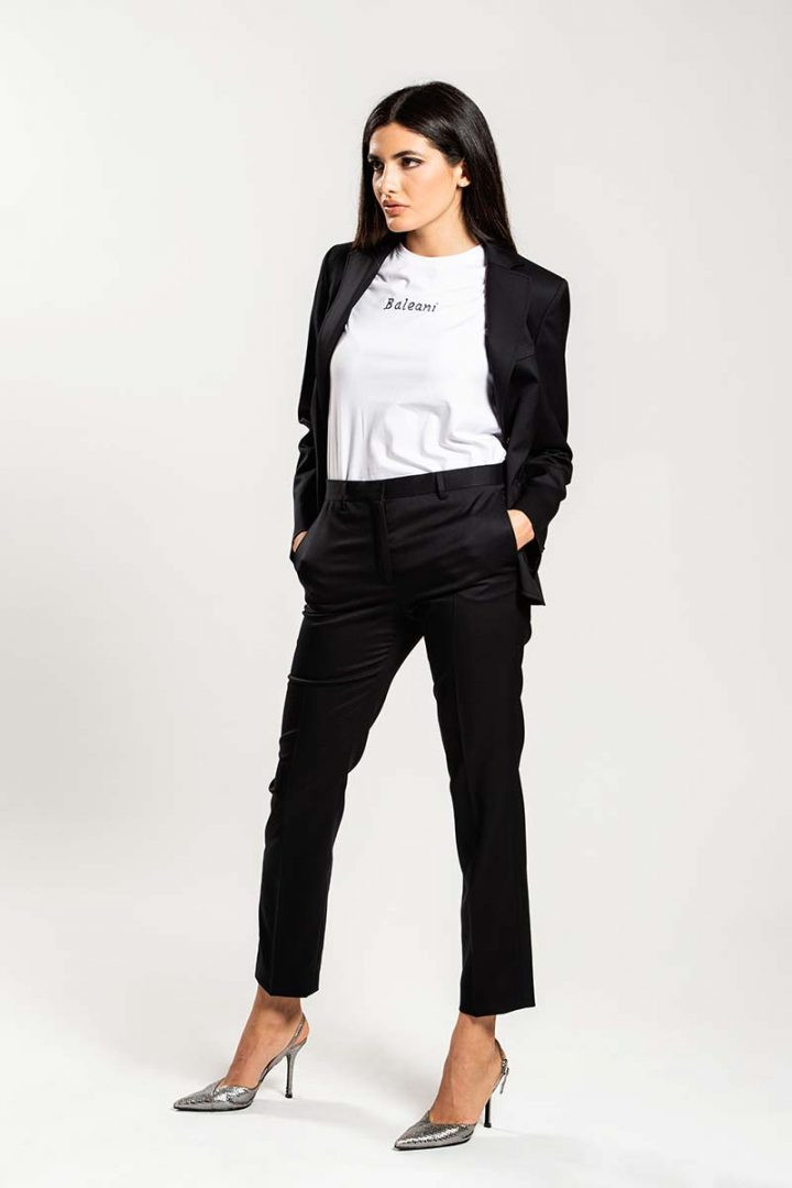 Made from a classic wool fabric and with an easy design, this regular suit depicts the woman in search of elegance.