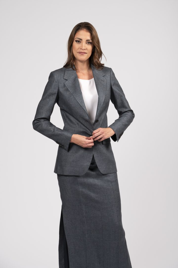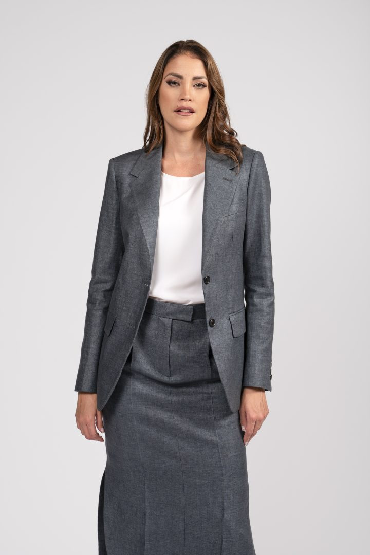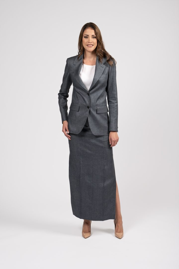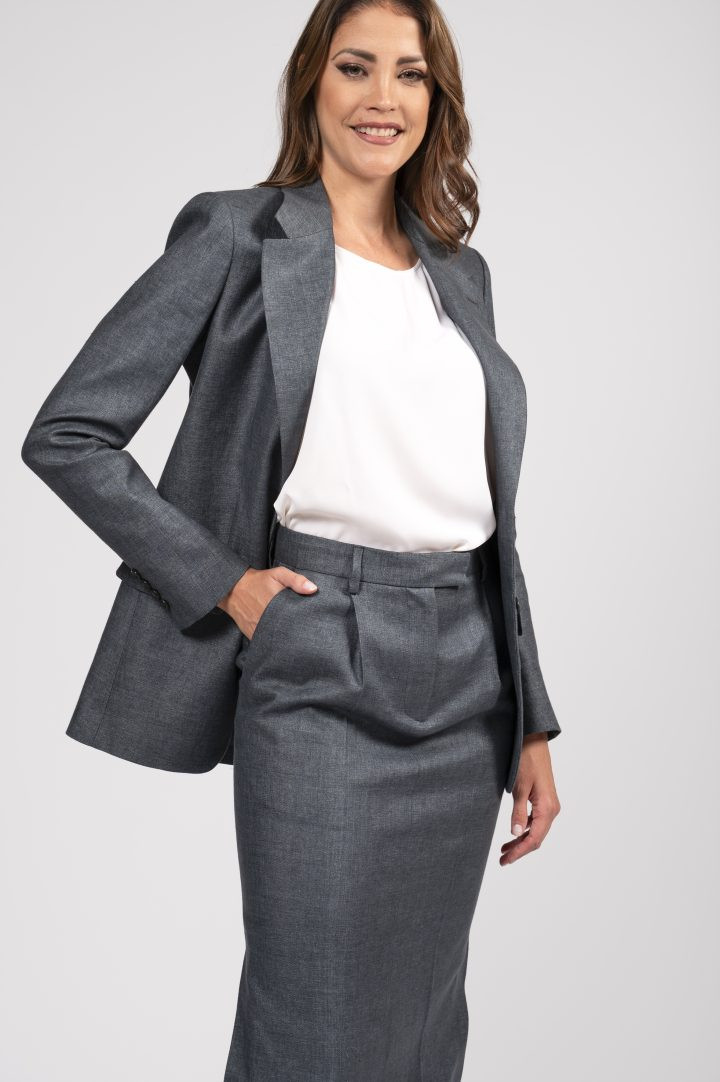 Completo donna composto da giacca sartoriale monopetto e gonna lunga con spacco laterale, in tessuto grigio antracite. Il taglio della giacca valorizza la silhouette, mentre la gonna aggiunge un tocco sofisticato ed elegante. Ideale per un abbigliamento professionale o eventi formali.