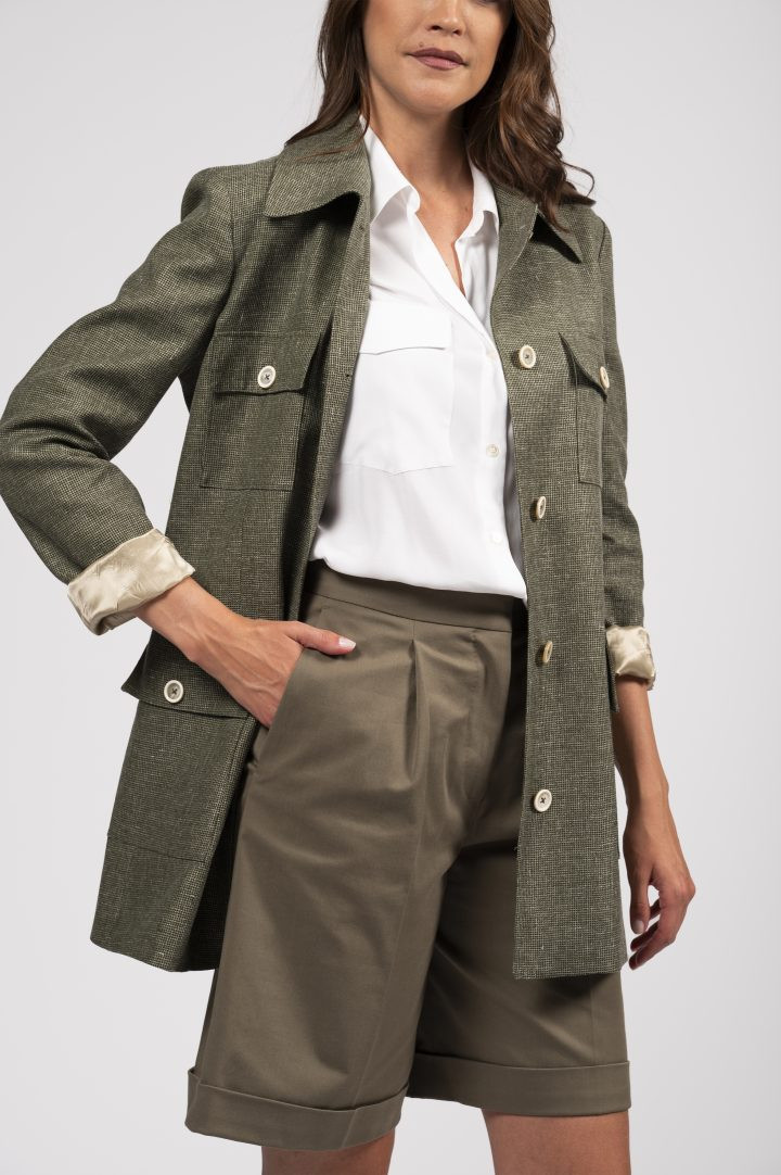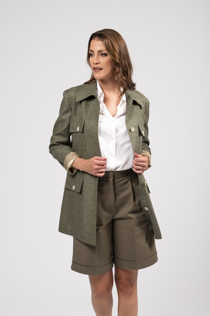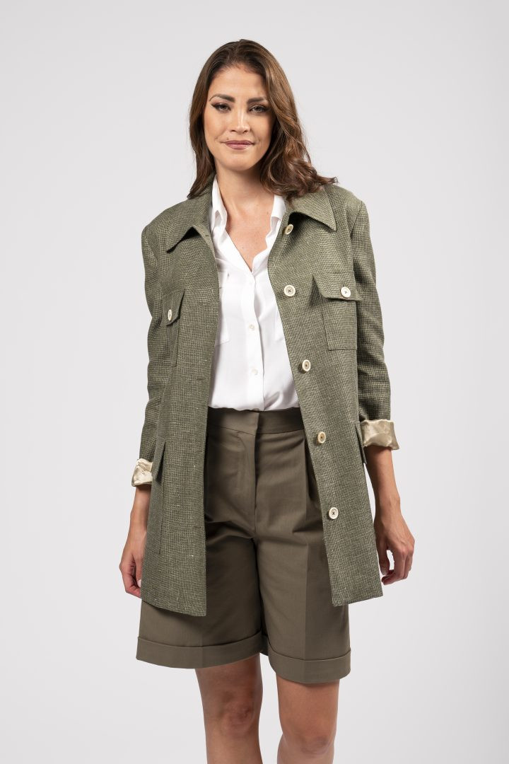 Giacca da donna lunga stile sahariana in tessuto verde con chiusura a bottoni e tasche applicate. Taglio dritto e vestibilità rilassata, adatta per un look casual elegante. Ideale da abbinare con shorts, jeans o pantaloni bianchi per la primavera e l’estate.