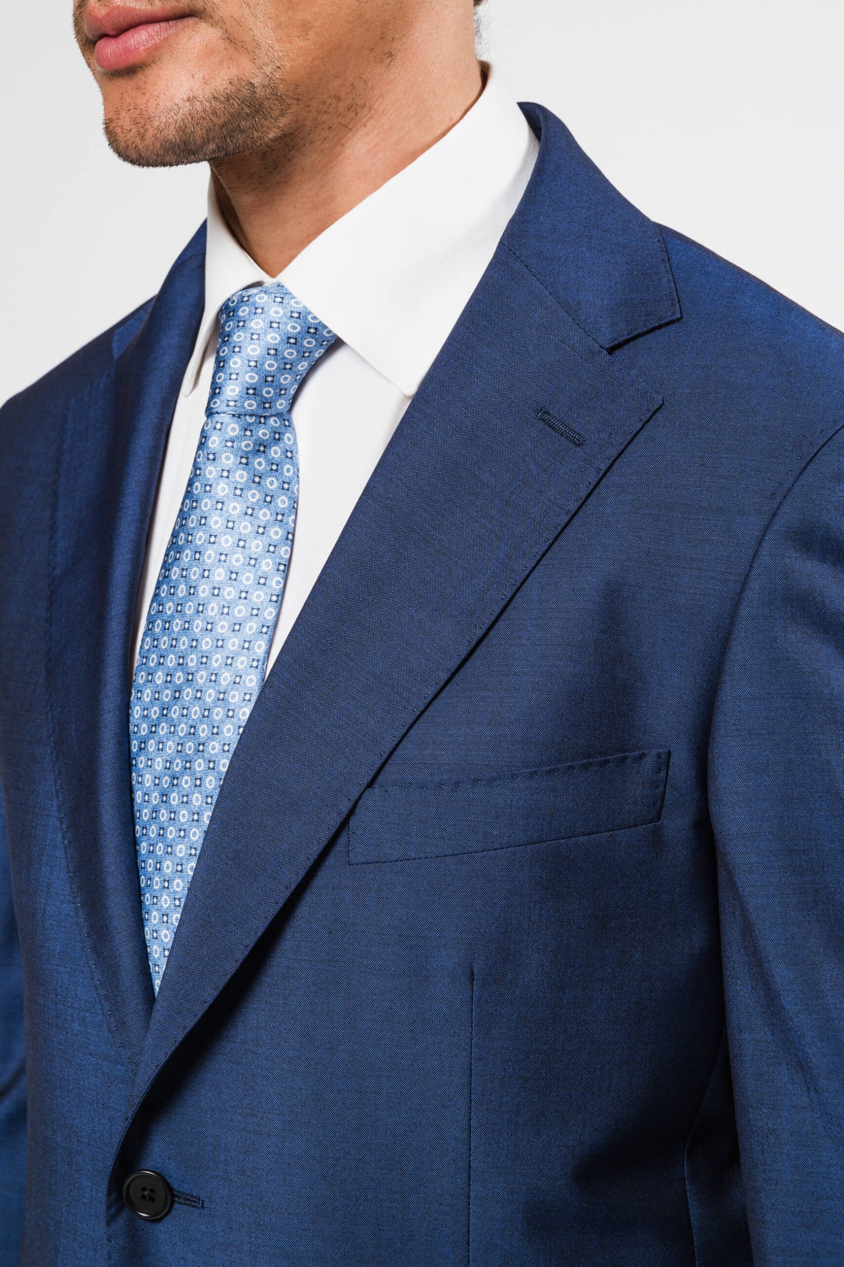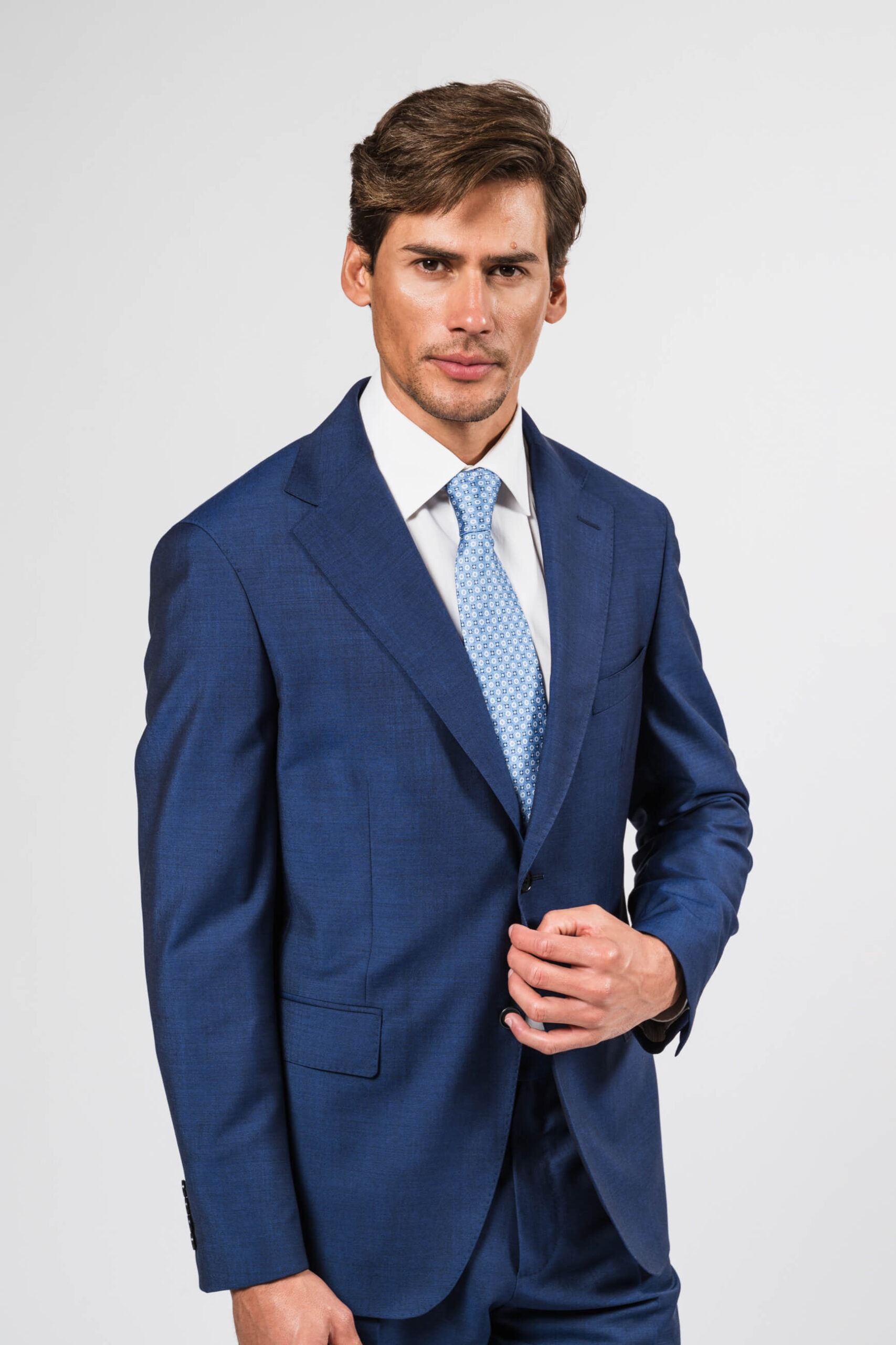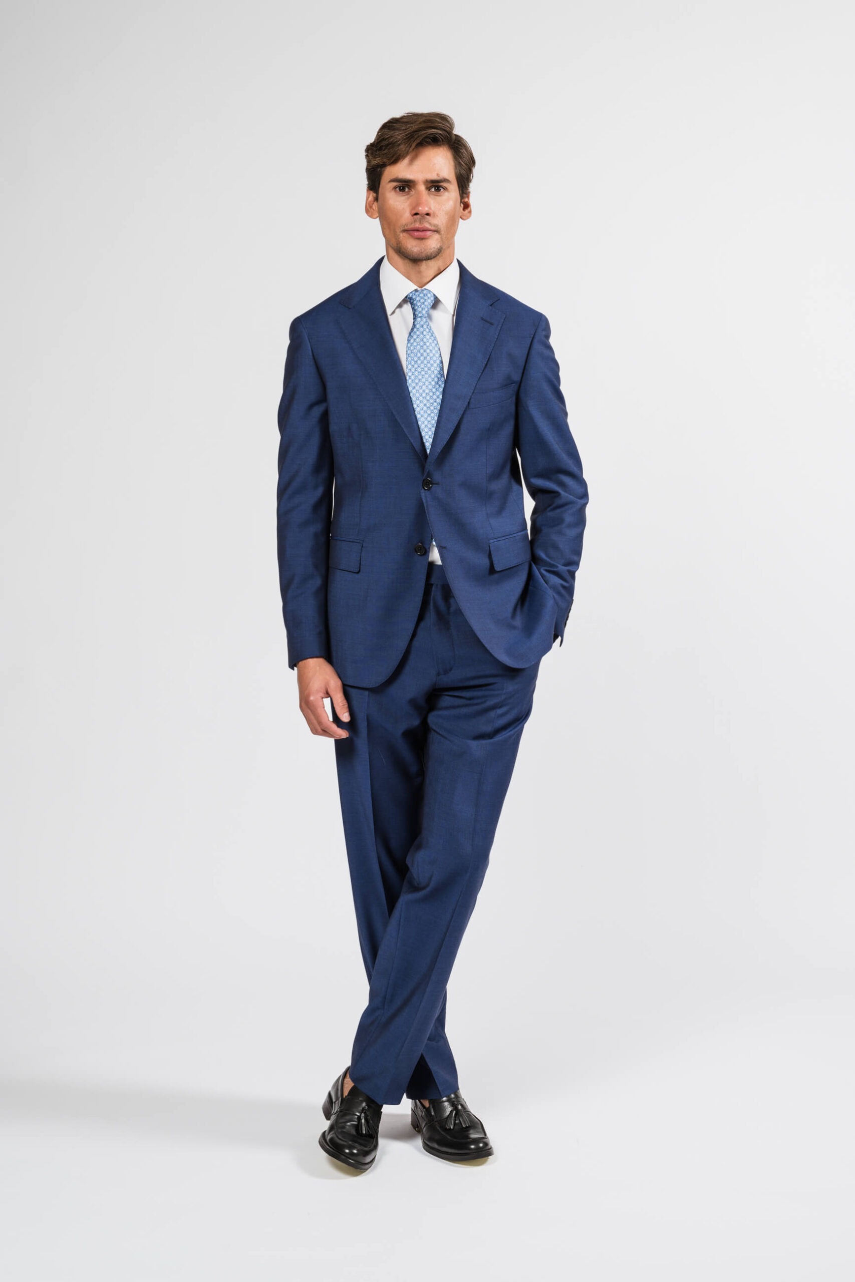 Giacca monopetto due bottoni – Tasche a doppio profilo con pattina e taschino pistagno sinistro – Pantalone senza pieghe – Tasche all’americana e due tasche dietro a doppio profilo – Composizione 100%lana – Vestibilità regular fit – Made in Italy
