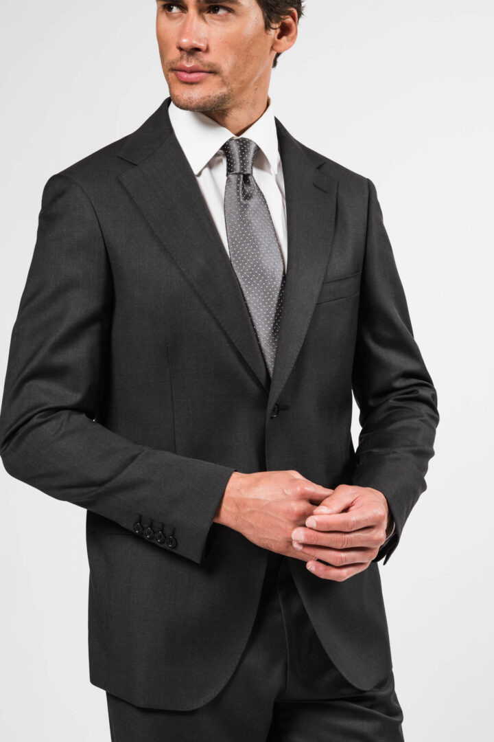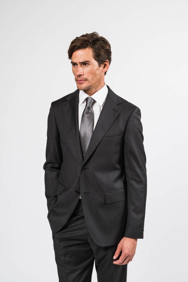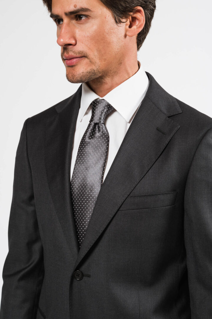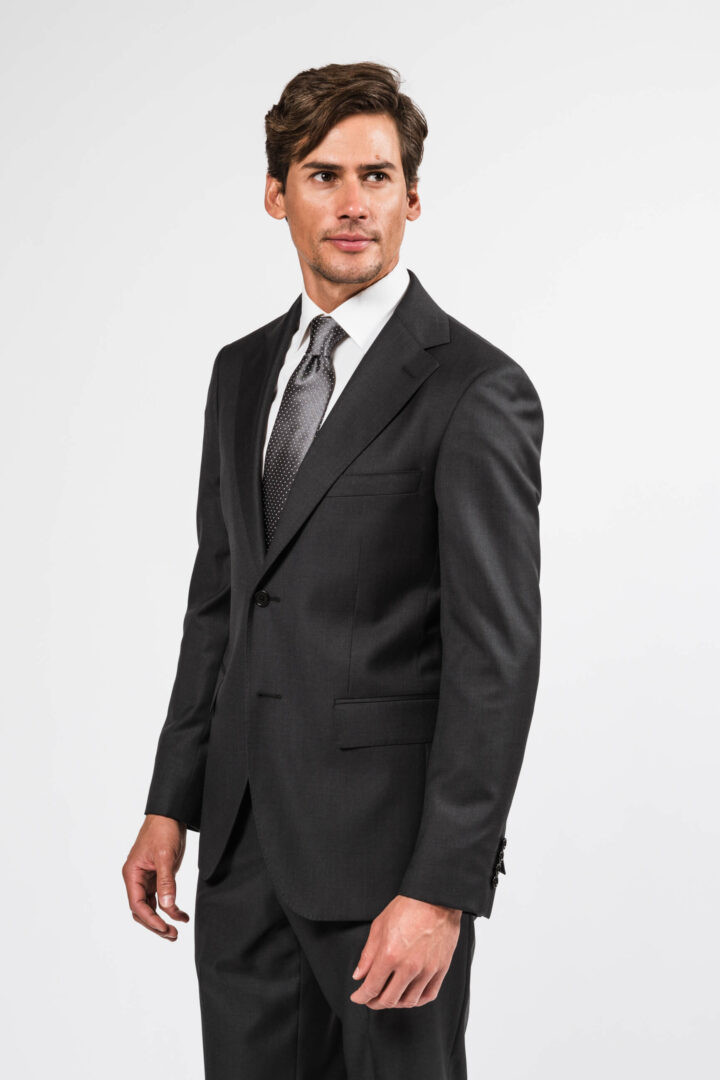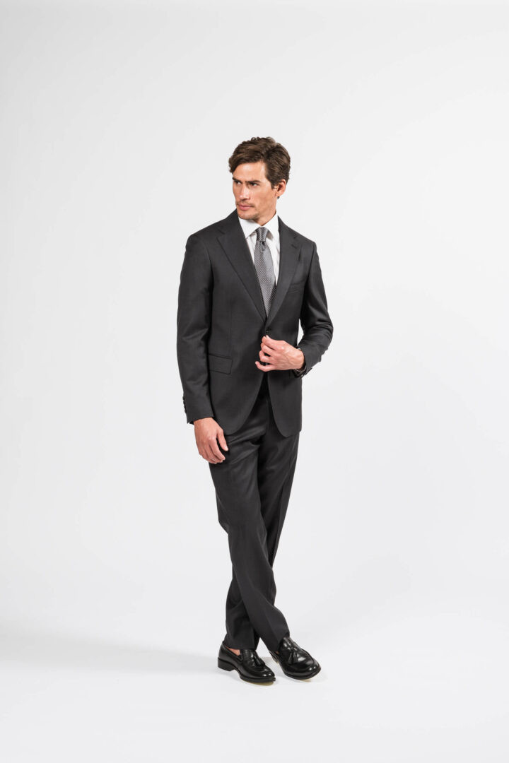 Giacca monopetto due bottoni – Tasche a doppio profilo con pattina e taschino pistagno sinistro – Pantalone senza pieghe – Tasche all’americana e due tasche dietro a doppio profilo – Composizione 100%lana – Vestibilità regular fit – Made in Italy