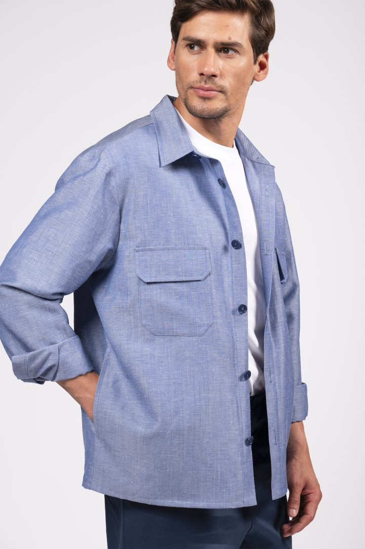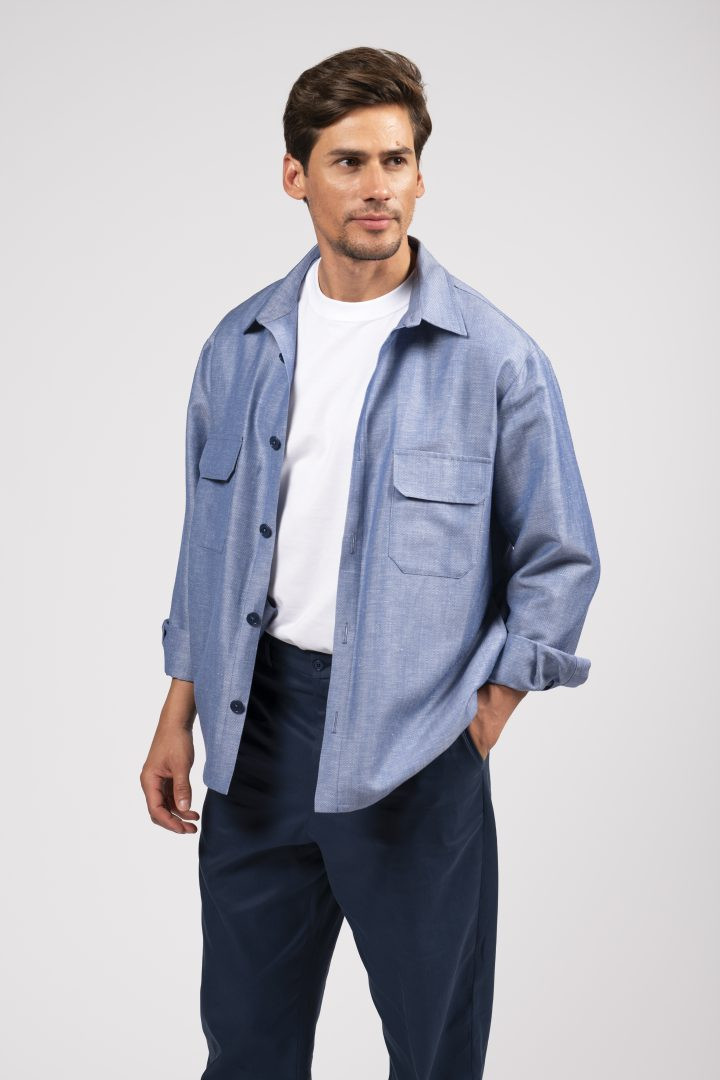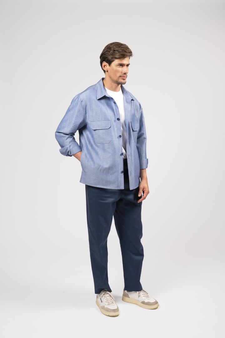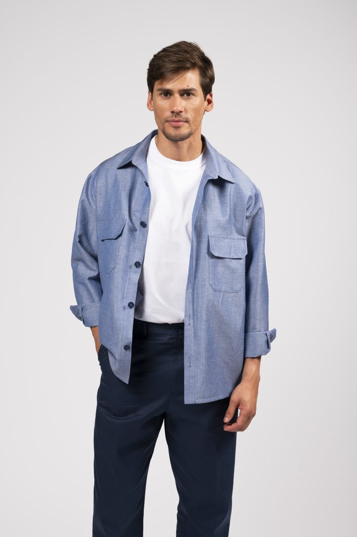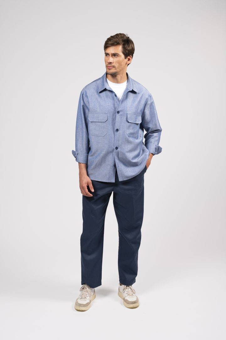 Camicia overshirt in cotone chambray blu con tasche applicate e taglio casual-chic, perfetta per uno stile rilassato ma curato.