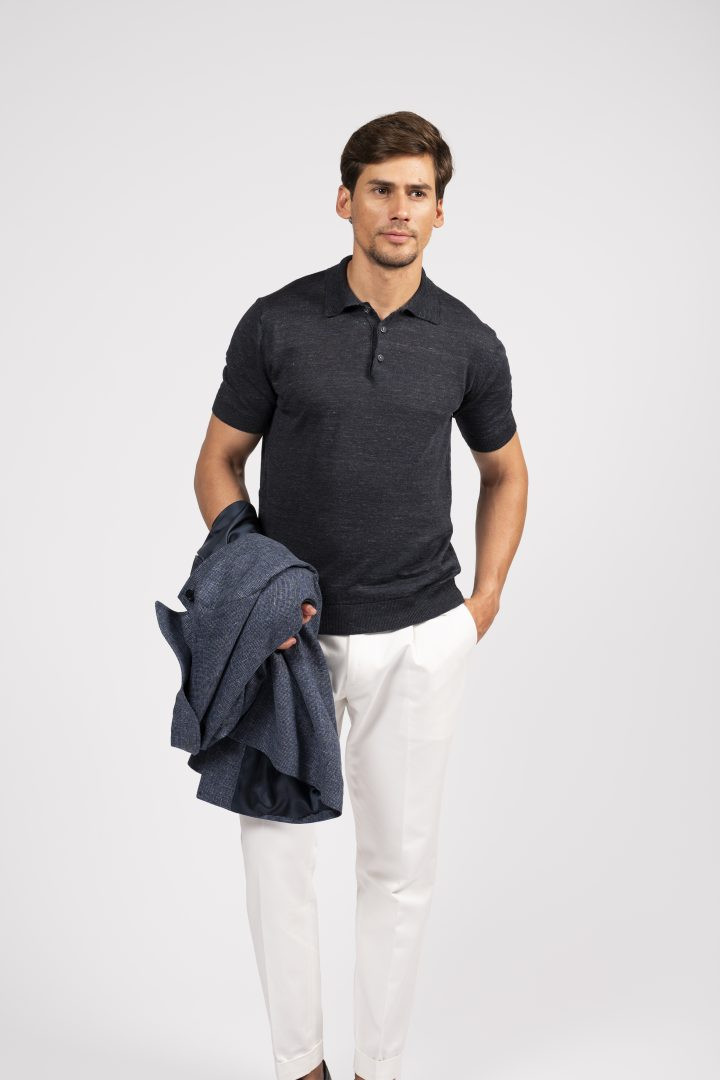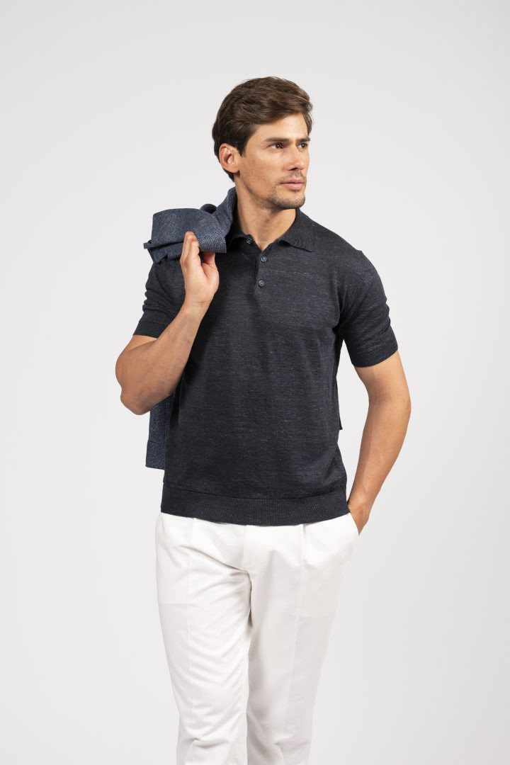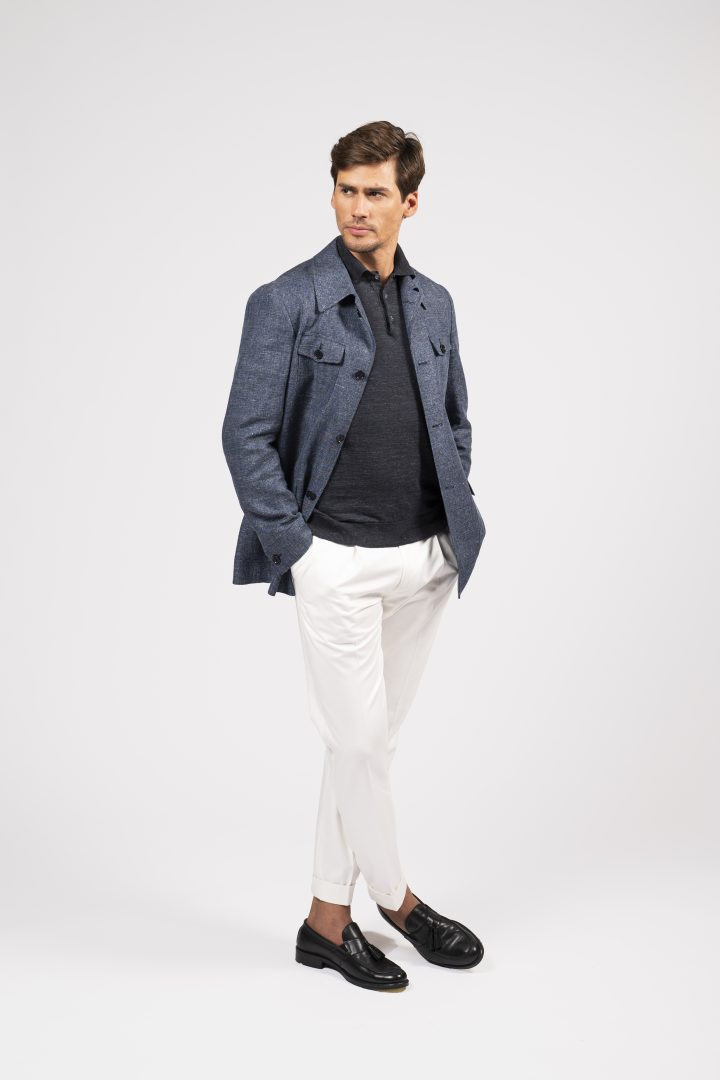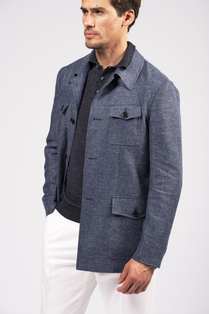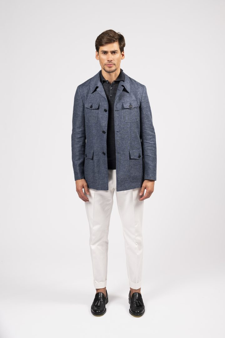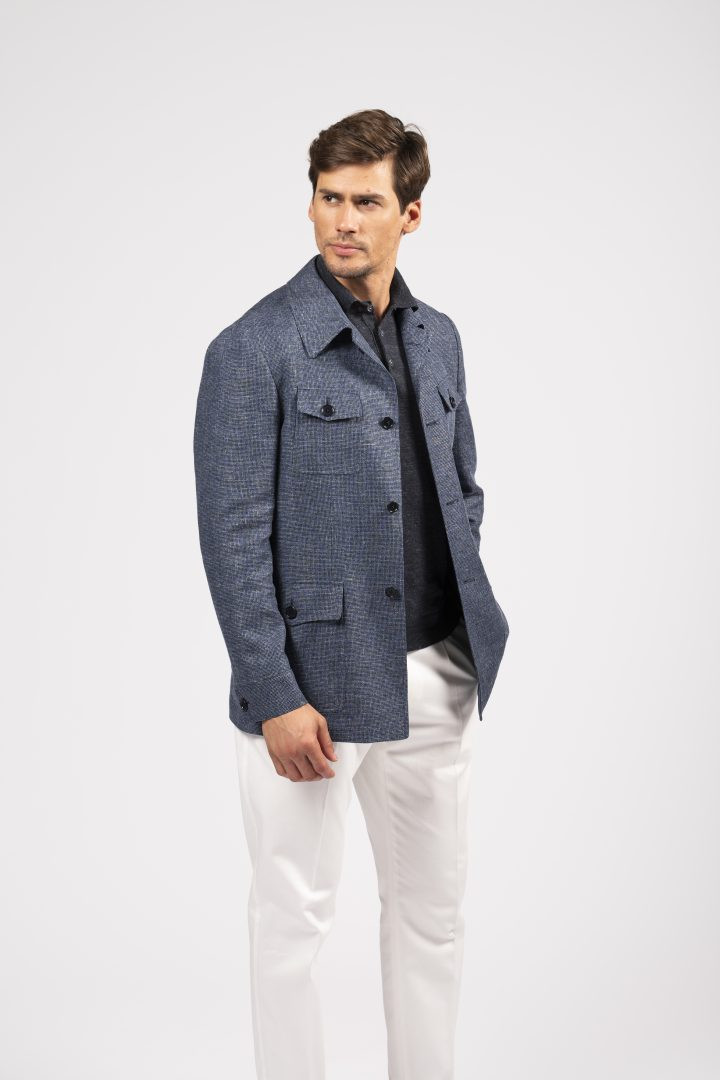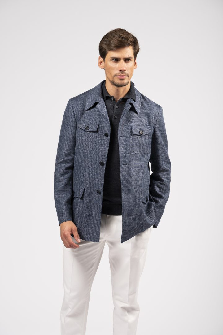 Sahariana in tessuto mélange blu, con tasche multiuso e taglio sartoriale: un classico rivisitato con eleganza moderna.