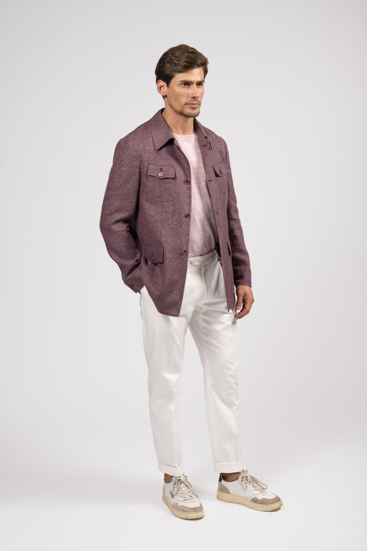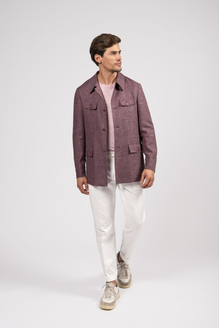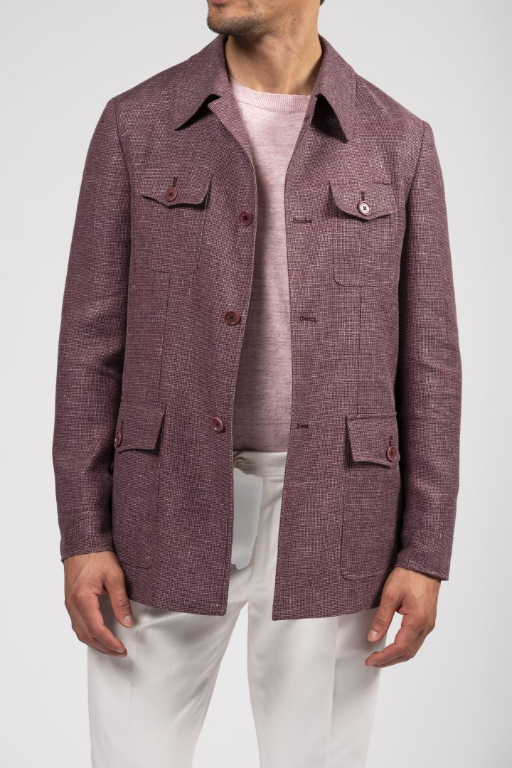 Sahariana in tessuto mélange bordeaux, con tasche multiuso e taglio sartoriale: un classico rivisitato con eleganza moderna.