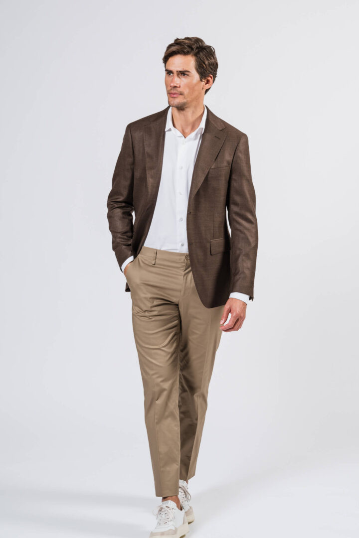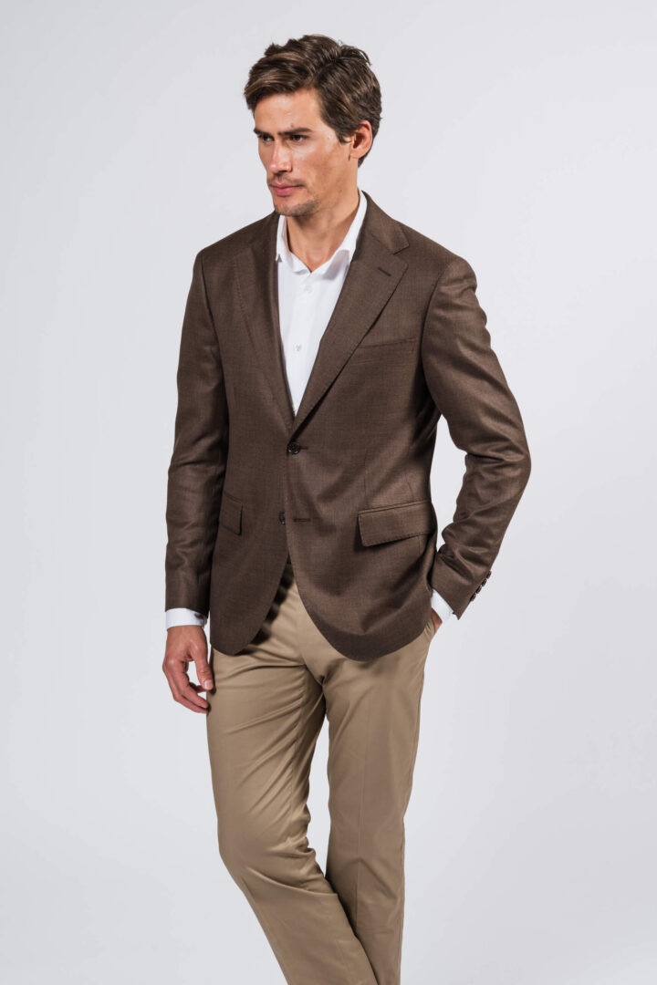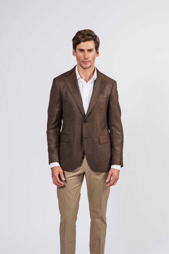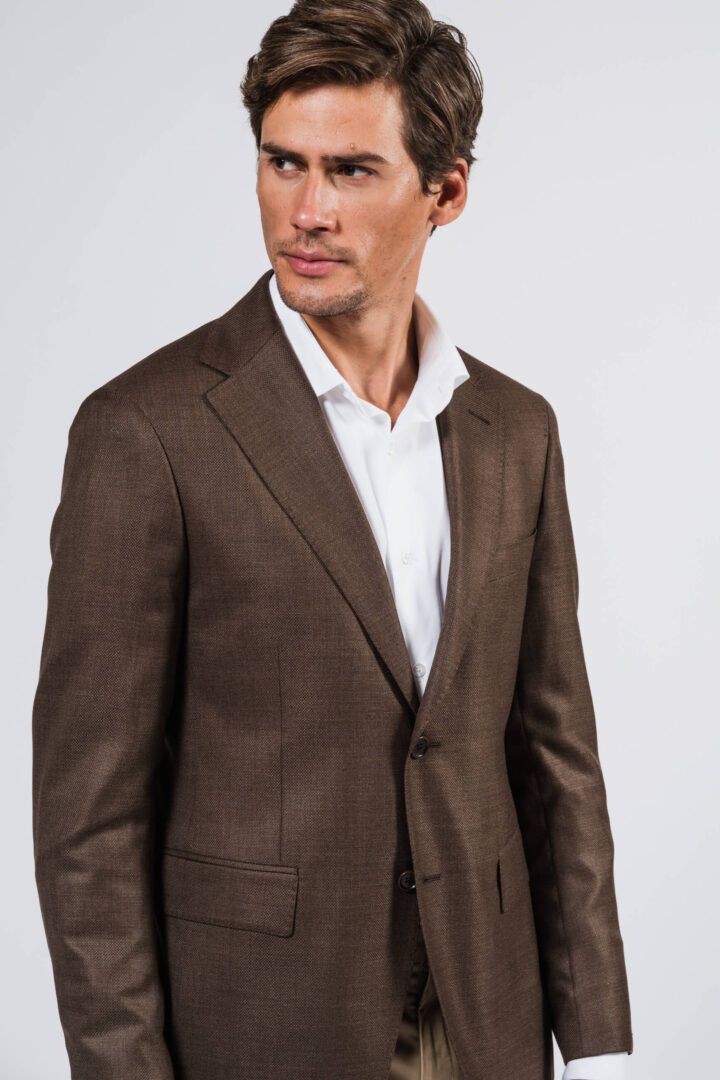 La cromia calda abbinata a questo filato di pura lana danno vita ad un giacca monopetto, dal fit lineare e confortevole.