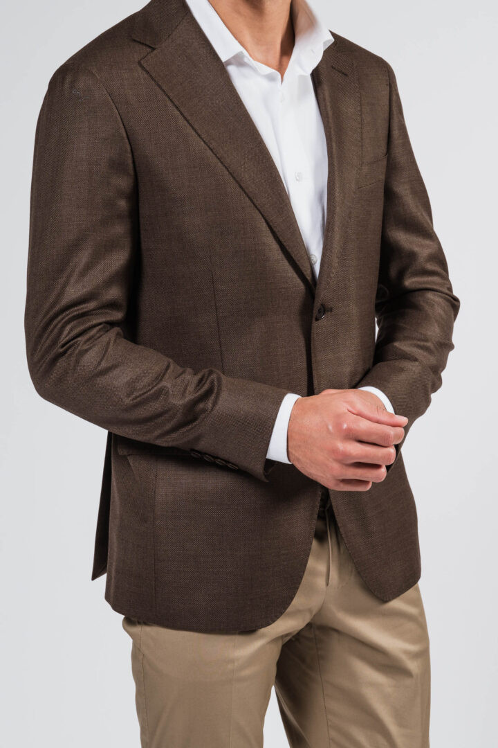 Giacca monopetto due bottoni – Dietro sfoderato – Tasche a doppio profilo con pattina e taschino pistagno sinistro – Impunture sartoriali – Composizione 100%lana – Vestibilità regular fit – Made in Italy