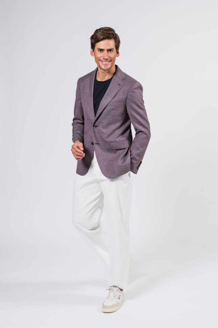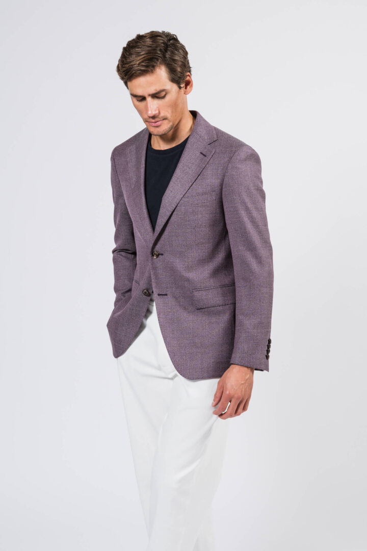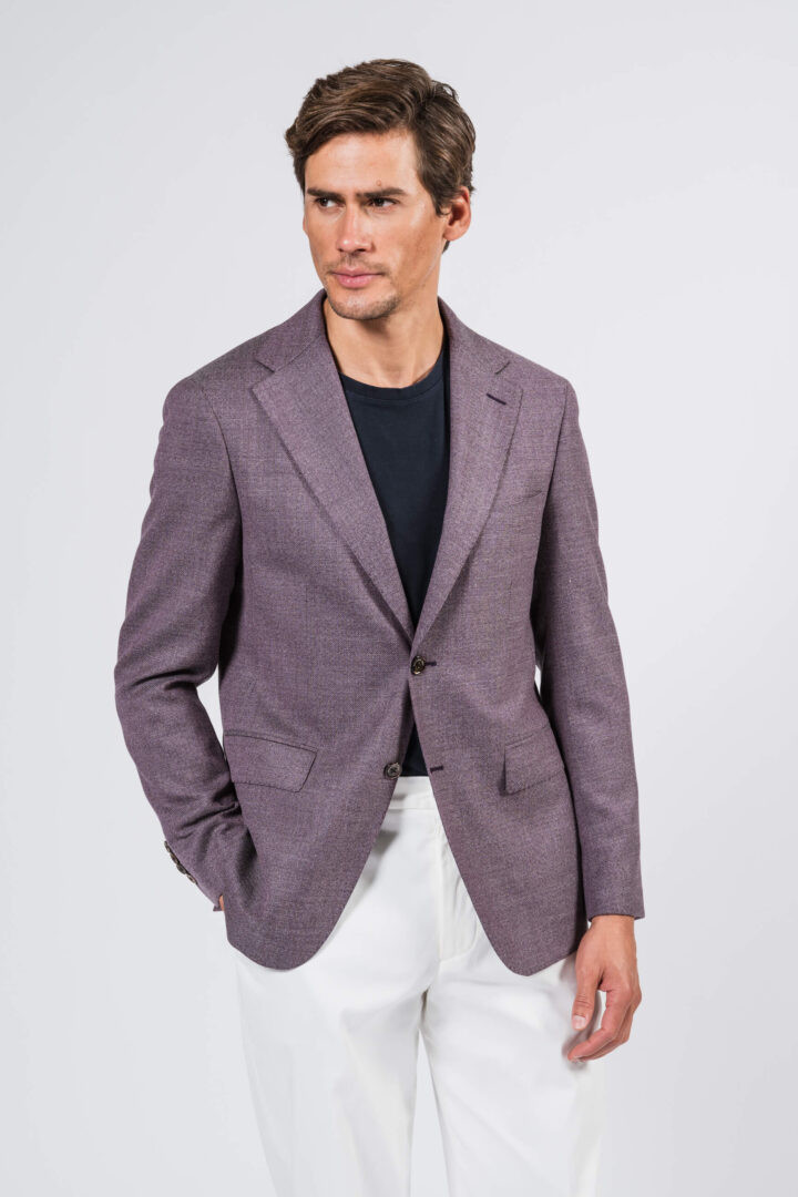 Incarnazione di comfort e leggerezza, questa giacca sfoderata monopetto in un tessuto di pura lana è proposta in un abbinamento cromatico di gran classe.
