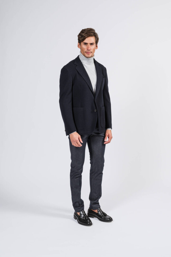 Giacca monopetto due bottoni – Decostruita e totalmente sfoderata – Tasche a toppa applicate e taschino pistagno sinistro – Impunture sartoriali – Composizione 70%lana 25%cotone 5%elastan – Vestibilità modern fit – Made in Italy